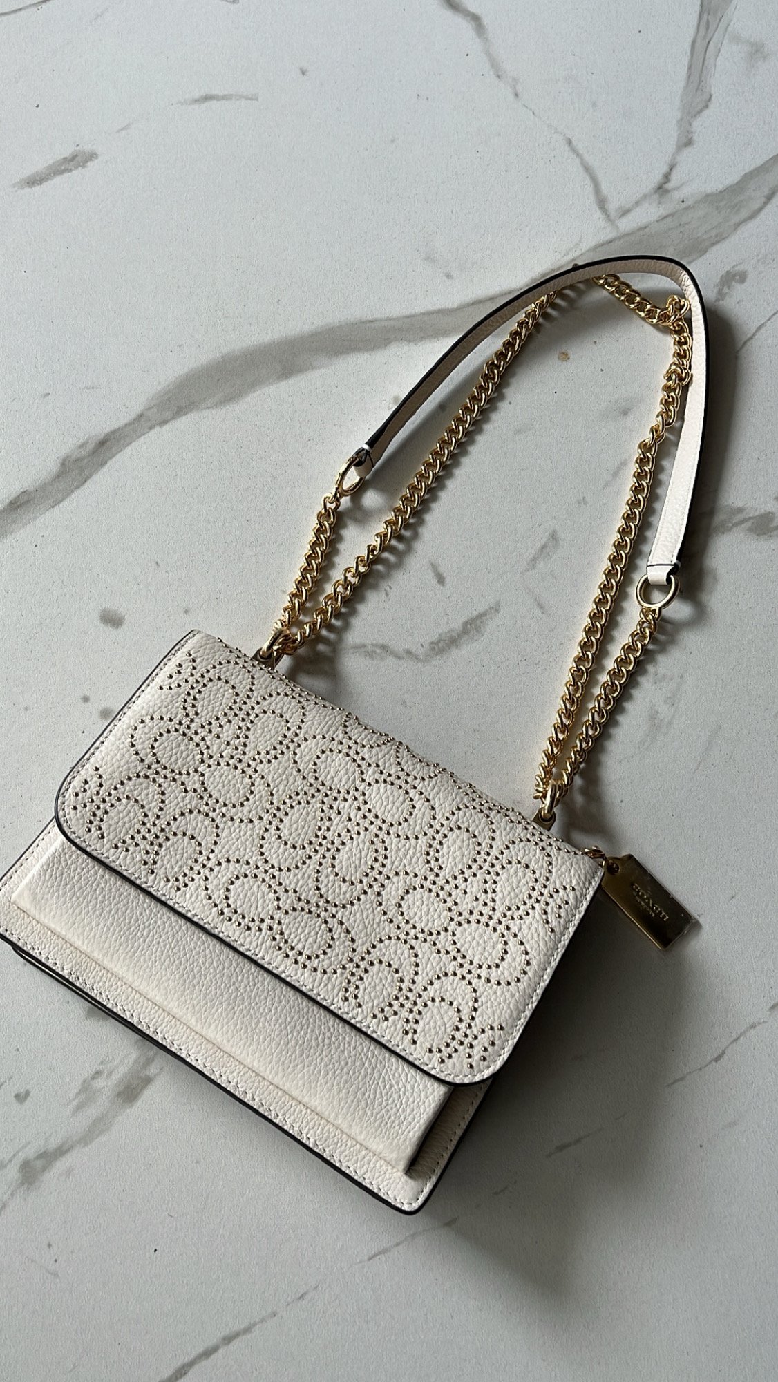 Cartera natural de Coach, con tachas y detalles en dorado. Tamaño mediano y con varias divisiones. Por dentro material de gamuza. Correa de cadenas regulable.