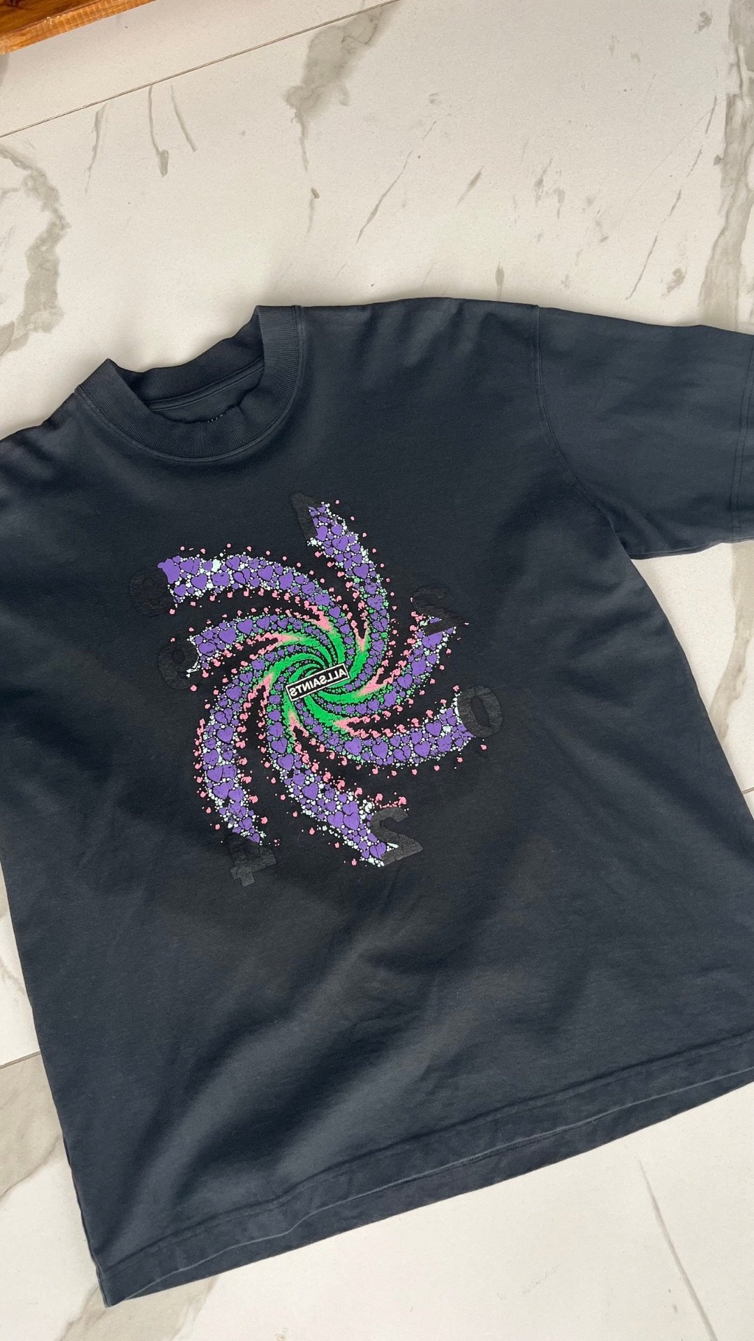 Remera negra, con diseño original en violeta, verde y rosa, oversize fit.