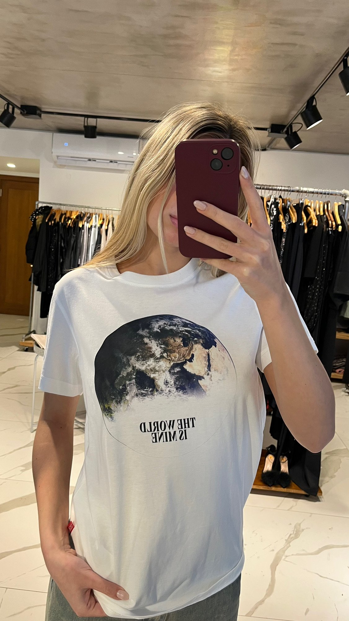 Remera blanca con diseño de planeta, calce suelto, talle S