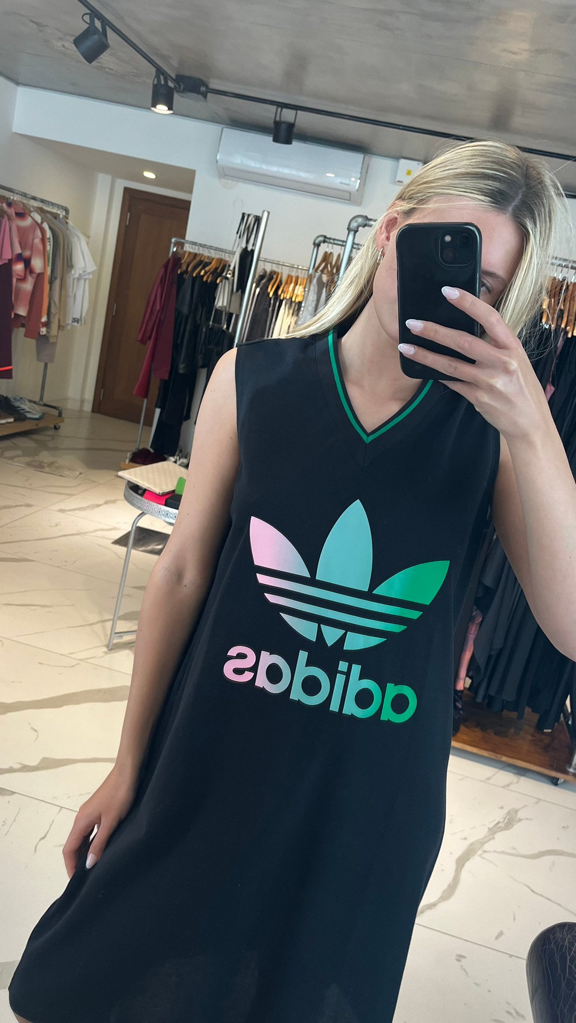 Vestido negro Adidas, con escote en V, diseño basket y logo efecto tornasolado. Talle L.